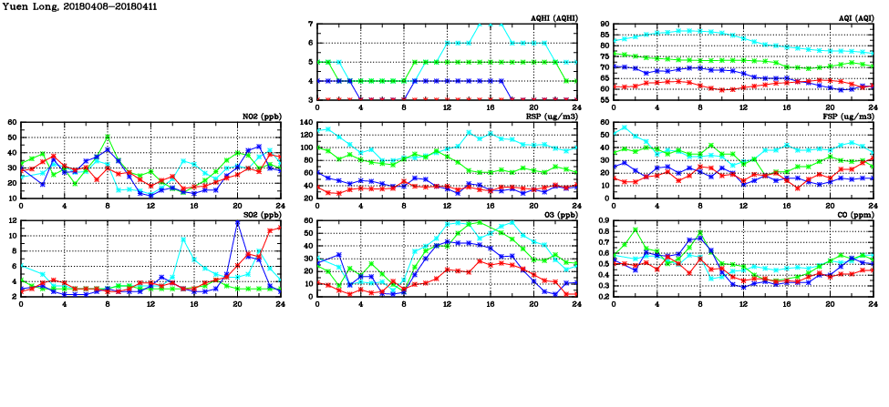 | Air Quality Data Time Series in Yuen Long (2018/04/11) | ( Line colors: Day -3 Day -2 Day -1 Current day ) | 2D Map Current AQHI |