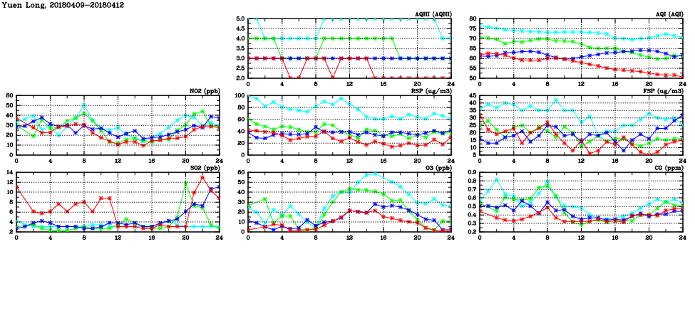 | Air Quality Data Time Series in Yuen Long (2018/04/12) | ( Line colors: Day -3 Day -2 Day -1 Current day ) | 2D Map Current AQHI |