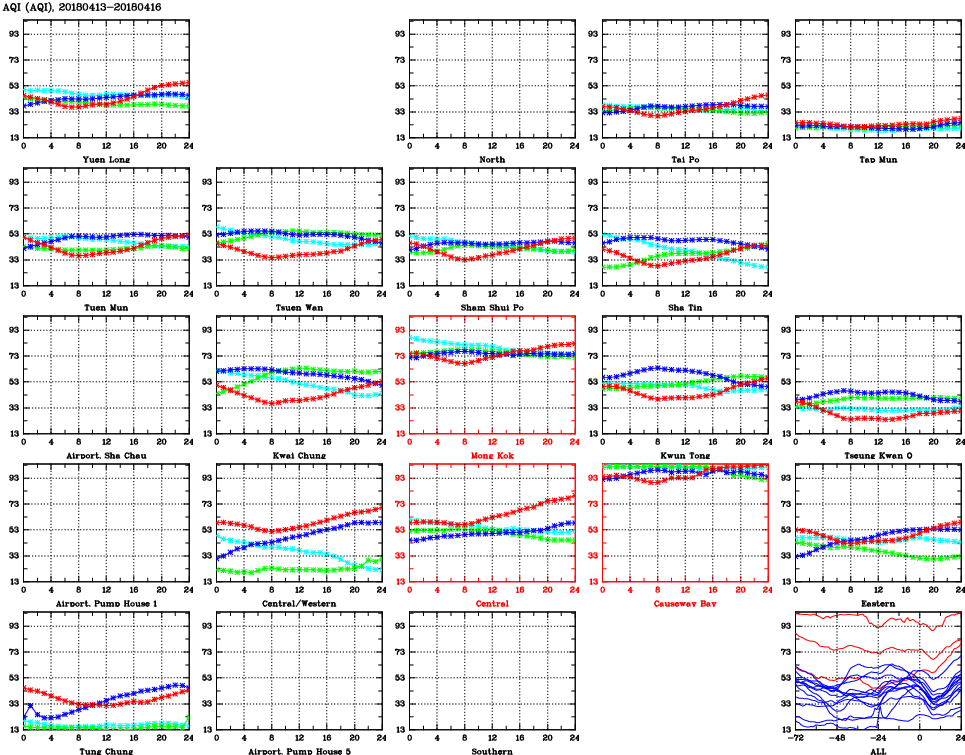 | Air Quality Data Time Series for AQI (2018/04/16) | ( Line colors: Day -3 Day -2 Day -1 Current day ) | 2D Map Current AQHI |