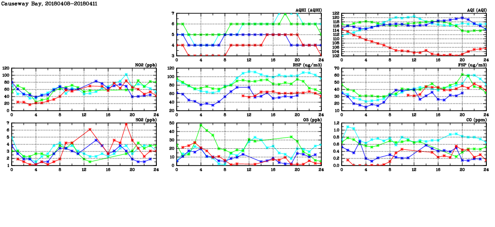| Air Quality Data Time Series in Causeway Bay (2018/04/11) | ( Line colors: Day -3 Day -2 Day -1 Current day ) | 2D Map Current AQHI |
