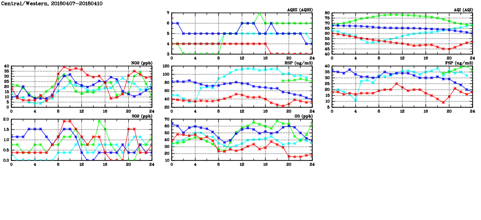 | Air Quality Data Time Series in Central/Western (2018/04/10) | ( Line colors: Day -3 Day -2 Day -1 Current day ) | 2D Map Current AQHI |