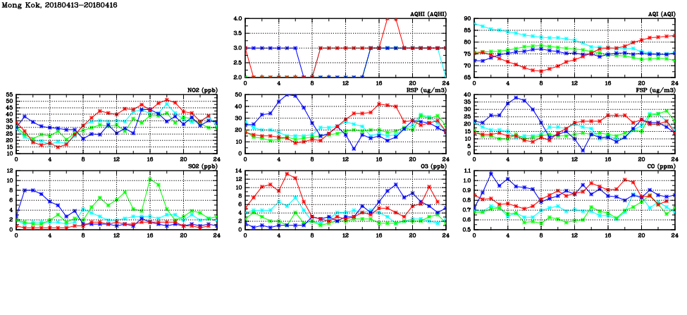 | Air Quality Data Time Series in Mong Kok (2018/04/16) | ( Line colors: Day -3 Day -2 Day -1 Current day ) | 2D Map Current AQHI |