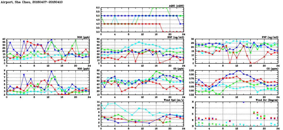 | Air Quality Data Time Series in Airport, Sha Chau (2018/04/10) | ( Line colors: Day -3 Day -2 Day -1 Current day ) | 2D Map Current AQHI |
