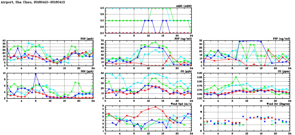 | Air Quality Data Time Series in Airport, Sha Chau (2018/04/13) | ( Line colors: Day -3 Day -2 Day -1 Current day ) | 2D Map Current AQHI |