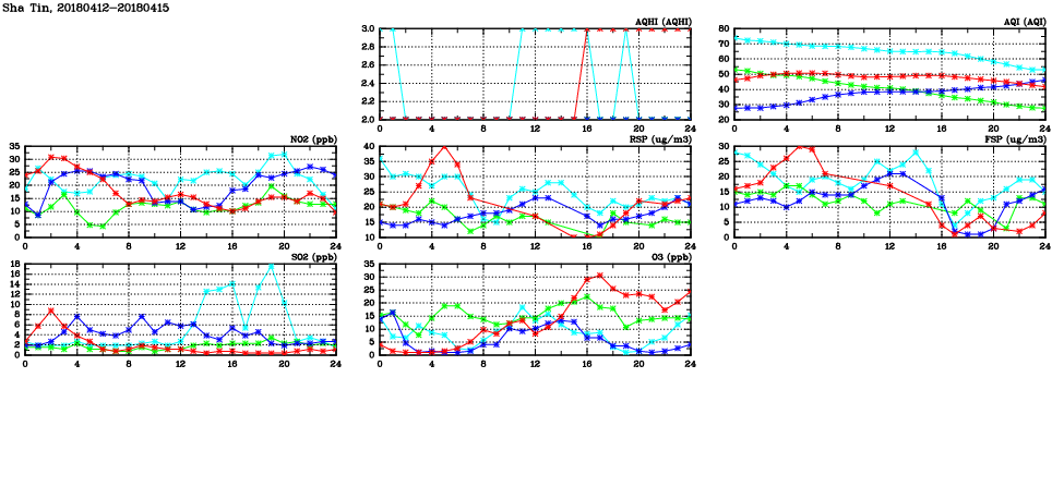 | Air Quality Data Time Series in Sha Tin (2018/04/15) | ( Line colors: Day -3 Day -2 Day -1 Current day ) | 2D Map Current AQHI |