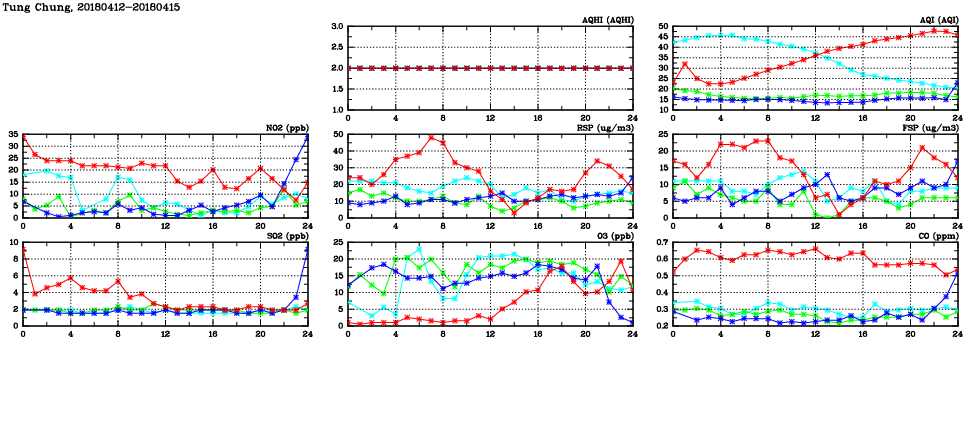 | Air Quality Data Time Series in Tung Chung (2018/04/15) | ( Line colors: Day -3 Day -2 Day -1 Current day ) | 2D Map Current AQHI |