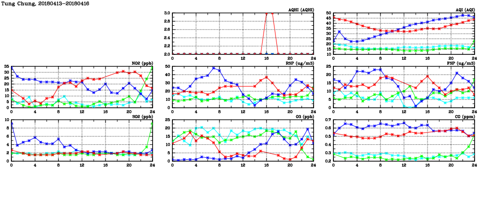 | Air Quality Data Time Series in Tung Chung (2018/04/16) | ( Line colors: Day -3 Day -2 Day -1 Current day ) | 2D Map Current AQHI |