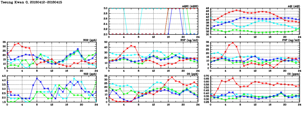 | Air Quality Data Time Series in Tseung Kwan O (2018/04/15) | ( Line colors: Day -3 Day -2 Day -1 Current day ) | 2D Map Current AQHI |