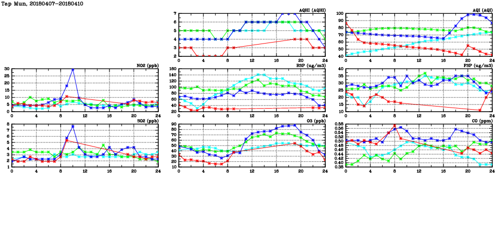 | Air Quality Data Time Series in Tap Mun (2018/04/10) | ( Line colors: Day -3 Day -2 Day -1 Current day ) | 2D Map Current AQHI |