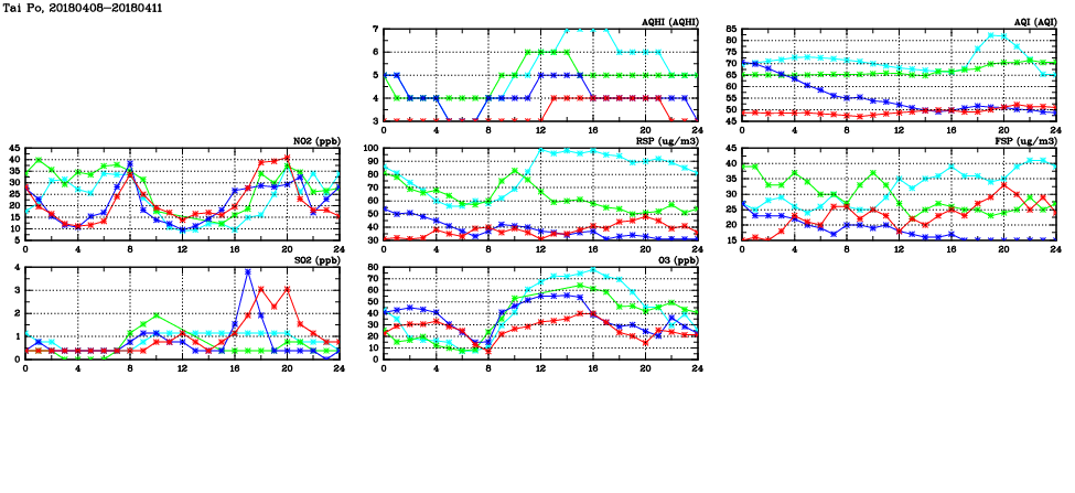 | Air Quality Data Time Series in Tai Po (2018/04/11) | ( Line colors: Day -3 Day -2 Day -1 Current day ) | 2D Map Current AQHI |