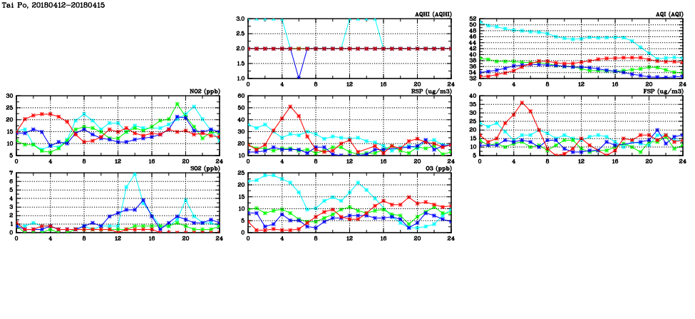| Air Quality Data Time Series in Tai Po (2018/04/15) | ( Line colors: Day -3 Day -2 Day -1 Current day ) | 2D Map Current AQHI |
