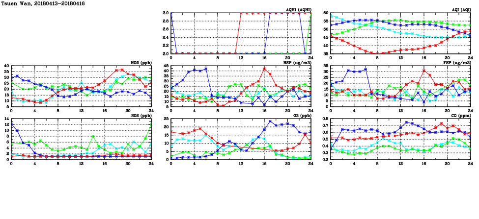 | Air Quality Data Time Series in Tsuen Wan (2018/04/16) | ( Line colors: Day -3 Day -2 Day -1 Current day ) | 2D Map Current AQHI |