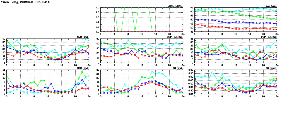 | Air Quality Data Time Series in Yuen Long (2018/04/14) | ( Line colors: Day -3 Day -2 Day -1 Current day ) | 2D Map Current AQHI |