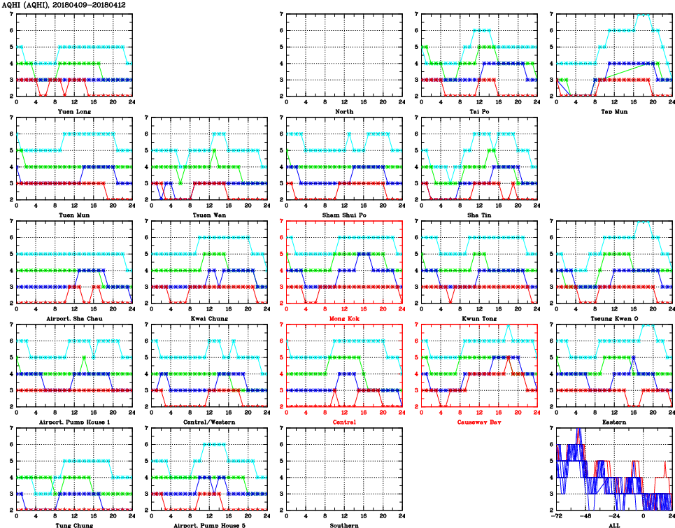 | Air Quality Data Time Series for AQHI (2018/04/12) | ( Line colors: Day -3 Day -2 Day -1 Current day ) | 2D Map Current AQHI |