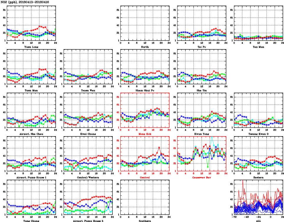 | Air Quality Data Time Series for NO2 (2018/04/16) | ( Line colors: Day -3 Day -2 Day -1 Current day ) | 2D Map Current AQHI |