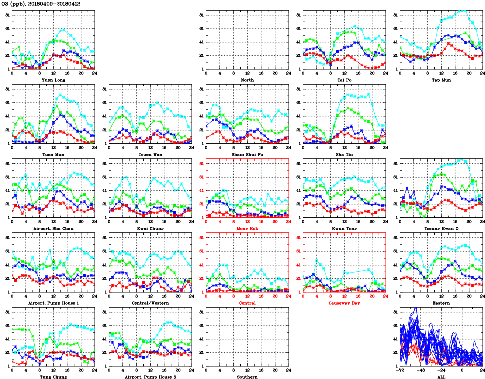 | Air Quality Data Time Series for O3 (2018/04/12) | ( Line colors: Day -3 Day -2 Day -1 Current day ) | 2D Map Current AQHI |