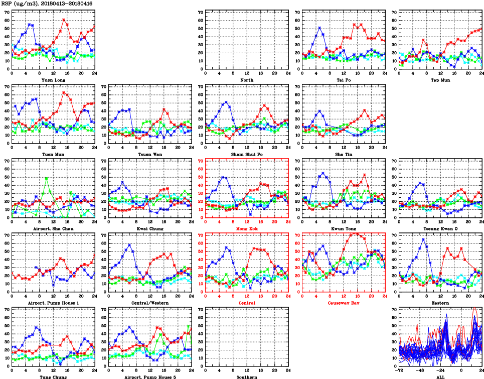 | Air Quality Data Time Series for RSP (2018/04/16) | ( Line colors: Day -3 Day -2 Day -1 Current day ) | 2D Map Current AQHI |