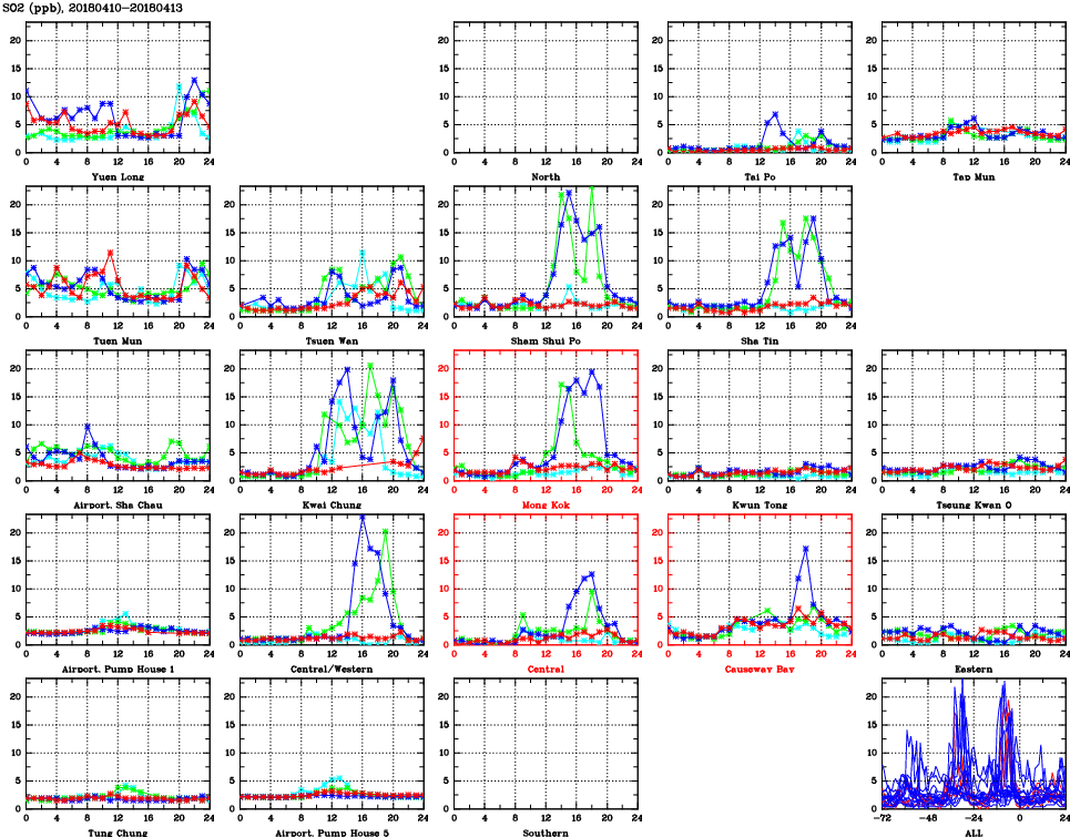 | Air Quality Data Time Series for SO2 (2018/04/13) | ( Line colors: Day -3 Day -2 Day -1 Current day ) | 2D Map Current AQHI |