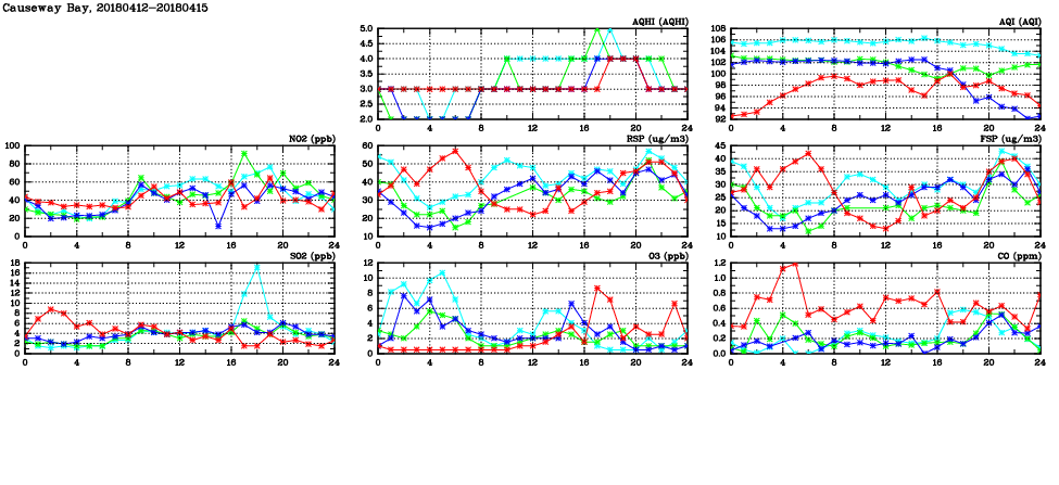| Air Quality Data Time Series in Causeway Bay (2018/04/15) | ( Line colors: Day -3 Day -2 Day -1 Current day ) | 2D Map Current AQHI |