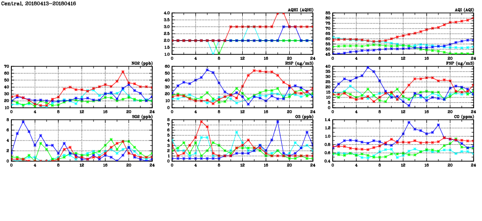 | Air Quality Data Time Series in Central (2018/04/16) | ( Line colors: Day -3 Day -2 Day -1 Current day ) | 2D Map Current AQHI |