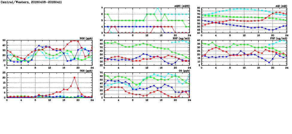 | Air Quality Data Time Series in Central/Western (2018/04/11) | ( Line colors: Day -3 Day -2 Day -1 Current day ) | 2D Map Current AQHI |