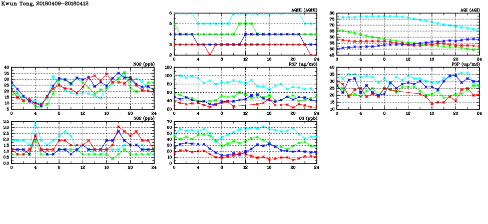 | Air Quality Data Time Series in Kwun Tong (2018/04/12) | ( Line colors: Day -3 Day -2 Day -1 Current day ) | 2D Map Current AQHI |