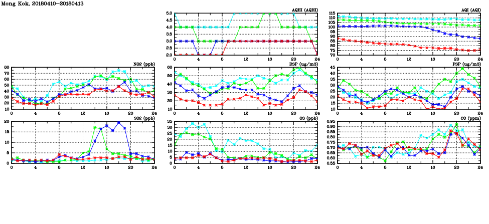 | Air Quality Data Time Series in Mong Kok (2018/04/13) | ( Line colors: Day -3 Day -2 Day -1 Current day ) | 2D Map Current AQHI |