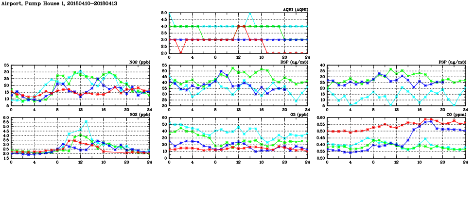 | Air Quality Data Time Series in Airport, Pump House 1 (2018/04/13) | ( Line colors: Day -3 Day -2 Day -1 Current day ) | 2D Map Current AQHI |