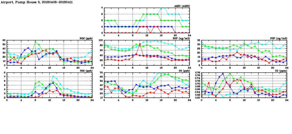 | Air Quality Data Time Series in Airport, Pump House 5 (2018/04/11) | ( Line colors: Day -3 Day -2 Day -1 Current day ) | 2D Map Current AQHI |