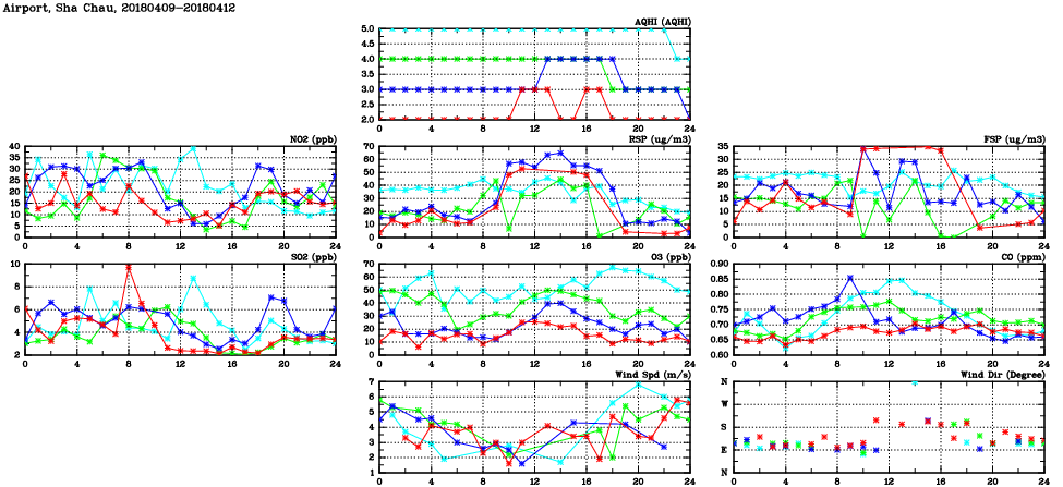 | Air Quality Data Time Series in Airport, Sha Chau (2018/04/12) | ( Line colors: Day -3 Day -2 Day -1 Current day ) | 2D Map Current AQHI |