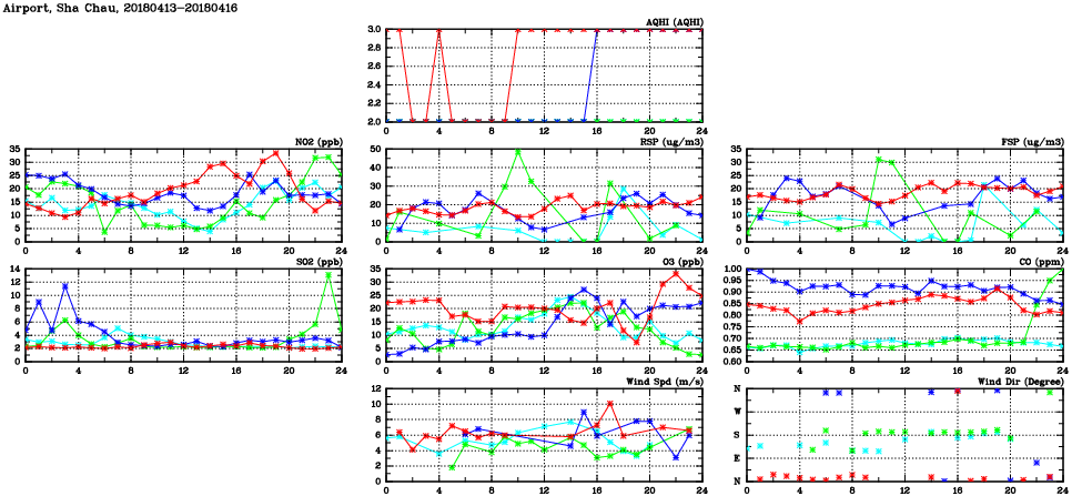| Air Quality Data Time Series in Airport, Sha Chau (2018/04/16) | ( Line colors: Day -3 Day -2 Day -1 Current day ) | 2D Map Current AQHI |