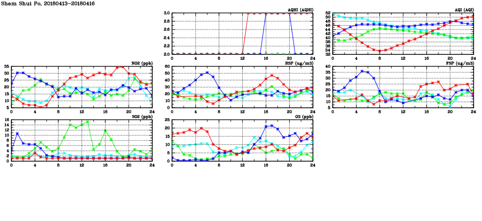 | Air Quality Data Time Series in Sham Shui Po (2018/04/16) | ( Line colors: Day -3 Day -2 Day -1 Current day ) | 2D Map Current AQHI |