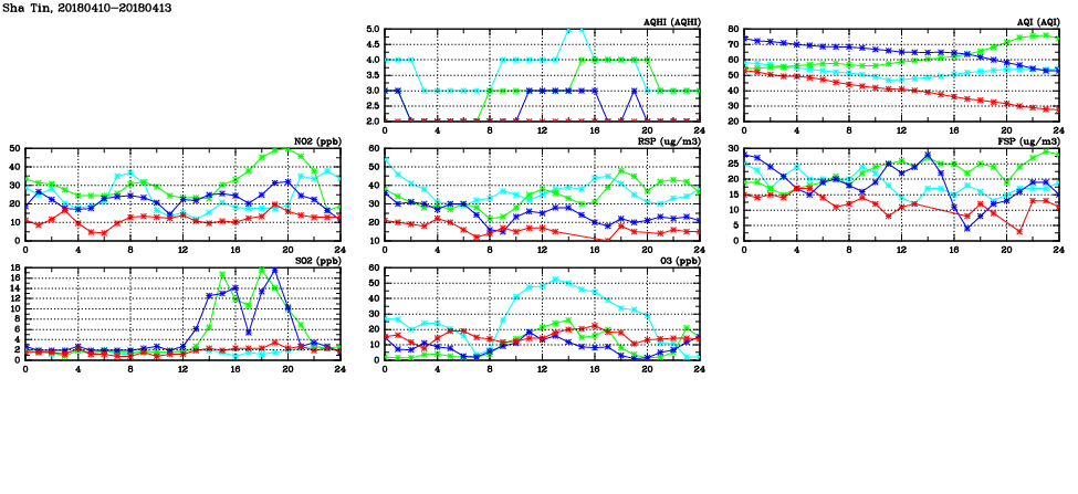 | Air Quality Data Time Series in Sha Tin (2018/04/13) | ( Line colors: Day -3 Day -2 Day -1 Current day ) | 2D Map Current AQHI |