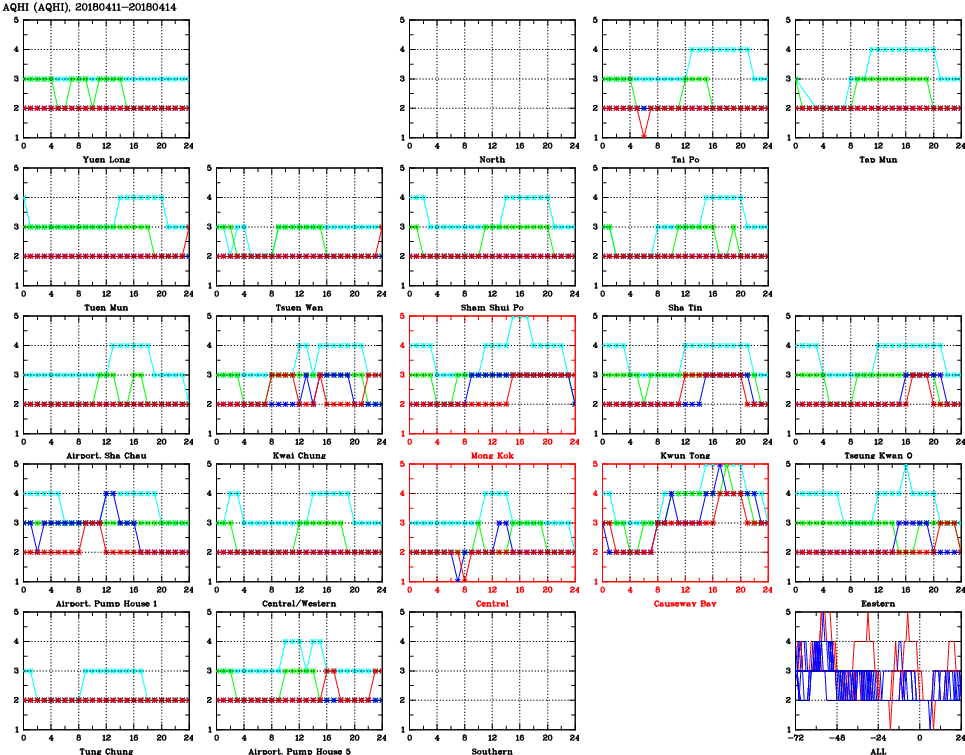 | Air Quality Data Time Series for AQHI (2018/04/14) | ( Line colors: Day -3 Day -2 Day -1 Current day ) | 2D Map Current AQHI |