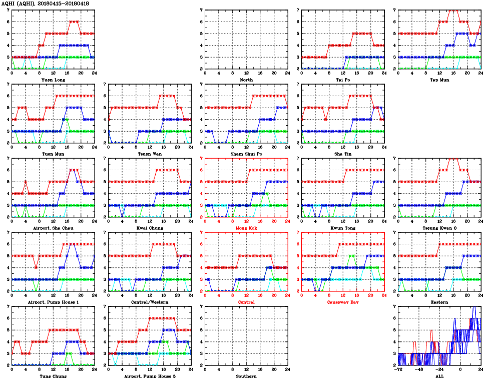| Air Quality Data Time Series for AQHI (2018/04/18) | ( Line colors: Day -3 Day -2 Day -1 Current day ) | 2D Map Current AQHI |