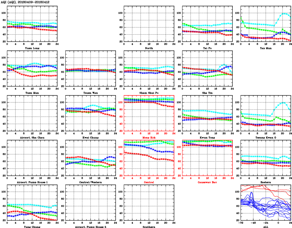 | Air Quality Data Time Series for AQI (2018/04/12) | ( Line colors: Day -3 Day -2 Day -1 Current day ) | 2D Map Current AQHI |
