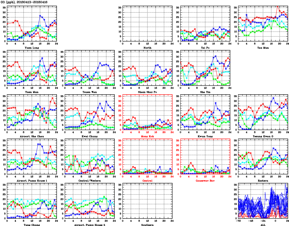 | Air Quality Data Time Series for O3 (2018/04/16) | ( Line colors: Day -3 Day -2 Day -1 Current day ) | 2D Map Current AQHI |