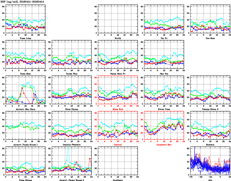 | Air Quality Data Time Series for RSP (2018/04/14) | ( Line colors: Day -3 Day -2 Day -1 Current day ) | 2D Map Current AQHI |