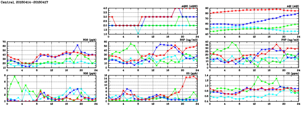 | Air Quality Data Time Series in Central (2018/04/17) | ( Line colors: Day -3 Day -2 Day -1 Current day ) | 2D Map Current AQHI |