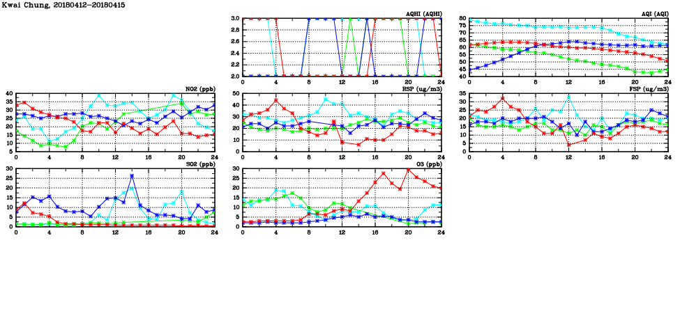 | Air Quality Data Time Series in Kwai Chung (2018/04/15) | ( Line colors: Day -3 Day -2 Day -1 Current day ) | 2D Map Current AQHI |