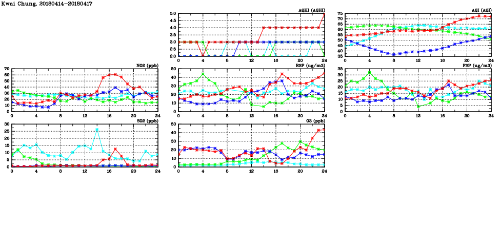 | Air Quality Data Time Series in Kwai Chung (2018/04/17) | ( Line colors: Day -3 Day -2 Day -1 Current day ) | 2D Map Current AQHI |