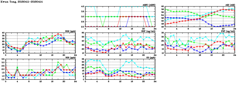 | Air Quality Data Time Series in Kwun Tong (2018/04/14) | ( Line colors: Day -3 Day -2 Day -1 Current day ) | 2D Map Current AQHI |