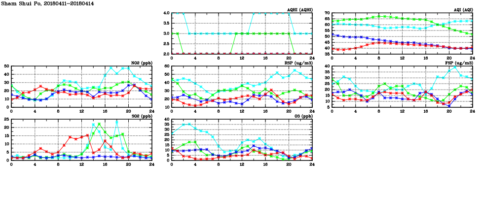 | Air Quality Data Time Series in Sham Shui Po (2018/04/14) | ( Line colors: Day -3 Day -2 Day -1 Current day ) | 2D Map Current AQHI |