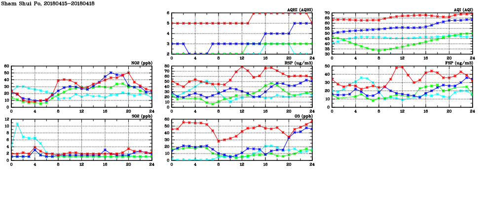| Air Quality Data Time Series in Sham Shui Po (2018/04/18) | ( Line colors: Day -3 Day -2 Day -1 Current day ) | 2D Map Current AQHI |