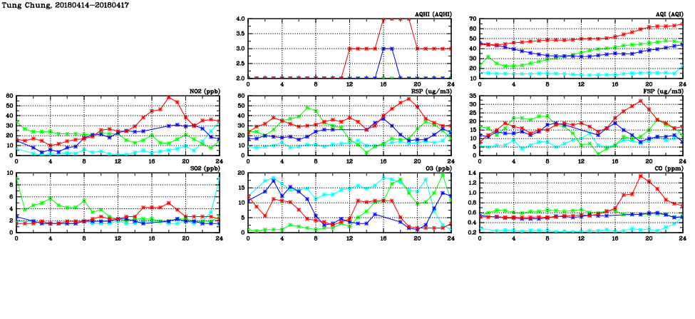 | Air Quality Data Time Series in Tung Chung (2018/04/17) | ( Line colors: Day -3 Day -2 Day -1 Current day ) | 2D Map Current AQHI |