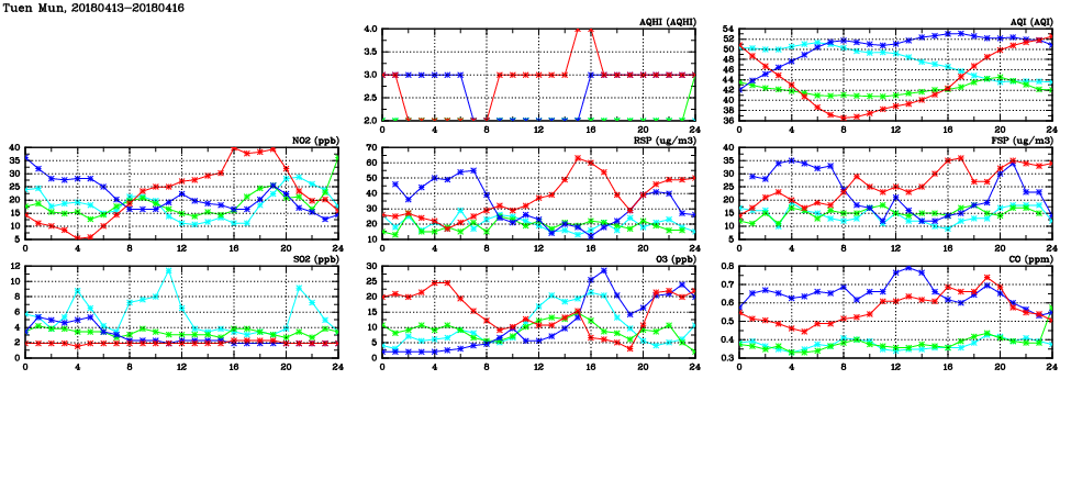| Air Quality Data Time Series in Tuen Mun (2018/04/16) | ( Line colors: Day -3 Day -2 Day -1 Current day ) | 2D Map Current AQHI |
