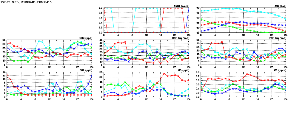 | Air Quality Data Time Series in Tsuen Wan (2018/04/15) | ( Line colors: Day -3 Day -2 Day -1 Current day ) | 2D Map Current AQHI |