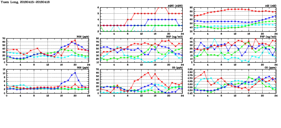 | Air Quality Data Time Series in Yuen Long (2018/04/18) | ( Line colors: Day -3 Day -2 Day -1 Current day ) | 2D Map Current AQHI |