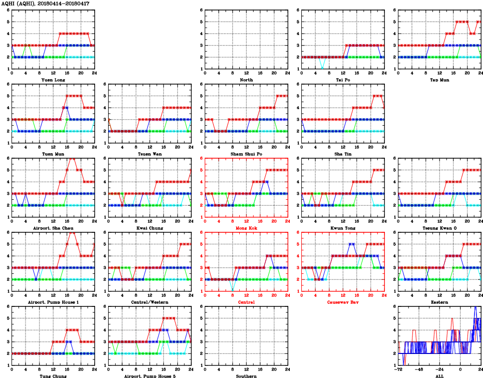 | Air Quality Data Time Series for AQHI (2018/04/17) | ( Line colors: Day -3 Day -2 Day -1 Current day ) | 2D Map Current AQHI |