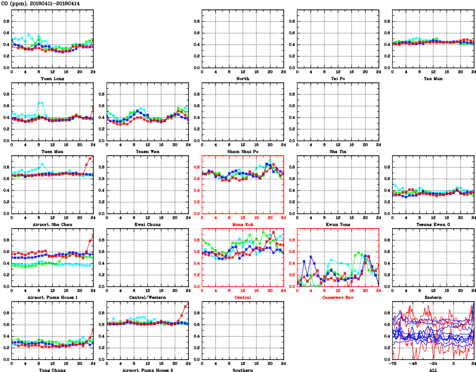 | Air Quality Data Time Series for CO (2018/04/14) | ( Line colors: Day -3 Day -2 Day -1 Current day ) | 2D Map Current AQHI |